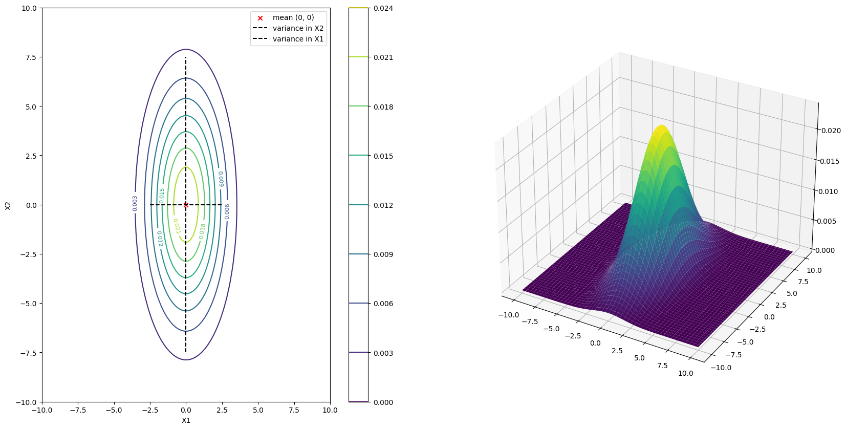 This contour plot is indeed an accurate representation of the probability density function of the random vector \(\boldsymbol{X}\). You can indeed see the mean at the center of the plot \((0, 0)\) and the variance in the \(X_1\) and \(X_2\) direction are approximately in proportion of \(3\) and \(15\) respectively.
